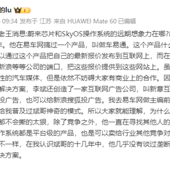 【为什么蔚来研发出蔚来芯片是汽车圈的共赢,因为李斌不想“搞死”竞争对手】近日,知名大V发文:以前曾经和李斌共事过4年。他在易车网搞过一个产品,叫做车易通。这个产品什么逻辑呢?汽车经销商可以通过这个产品把自己的最新报价发布到互联网上,而在另外一头他购买网易、搜狐、新浪等等公司的端口,把这些报价提供到这些网站上。